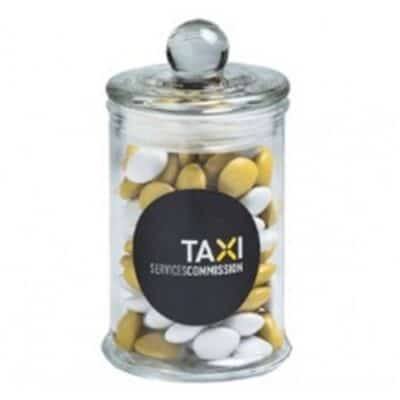 - Premium Branded Small Glass Jar with Choc Beans 100g customised with your branding. Ideal for client gifts, events, and marketing giveaways.