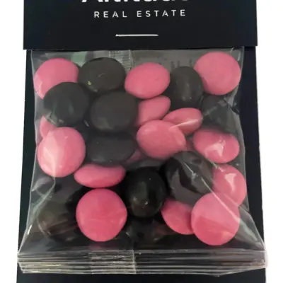 - Premium Branded Pillow Pack with Choc Beans 50g customised with your branding. Ideal for client gifts, events, and marketing giveaways.