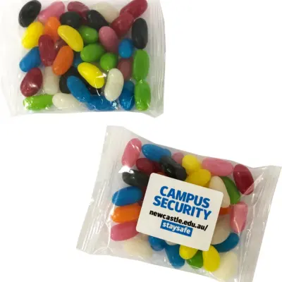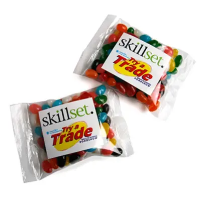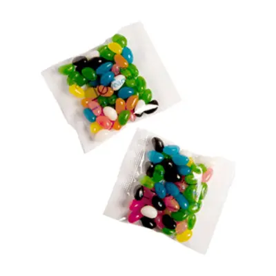 - Promotional Jelly Beans 90 gram pillow pack will always find an audience. A great item to have on permanent rotation in your marketing events.