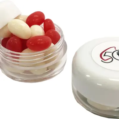 - Delicious Custom Tub filled with Mini Jelly Beans 80g branded with your logo. Perfect for promotional events, trade shows, and corporate gifts.