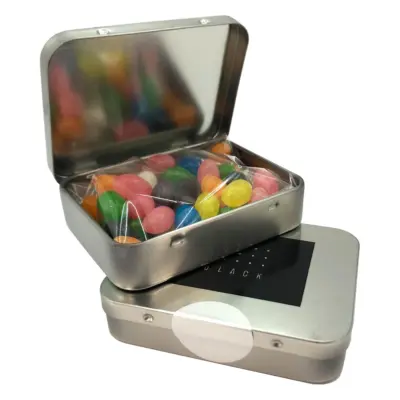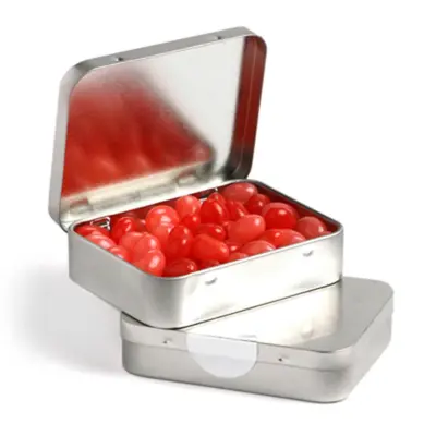 - Delicious Promotional Rectangle Hinge Tin filled with Mini Jelly Beans 65g branded with your logo. Perfect for promotional events, trade shows, and corporate gifts.