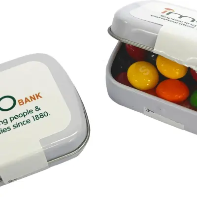 - Branded Small Rectangle Tin filled with Mini M&Ms 30g customised with your branding. Perfect for promotional events, corporate gifts, and marketing campaigns.