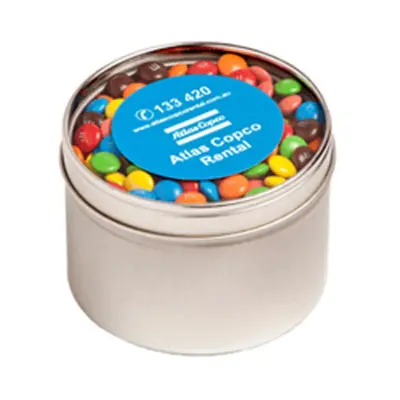 - Custom Small Round Window Tin with Mini M&Ms 140g customised with your branding. Perfect for promotional events, corporate gifts, and marketing campaigns.