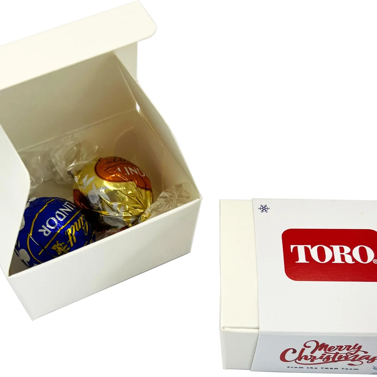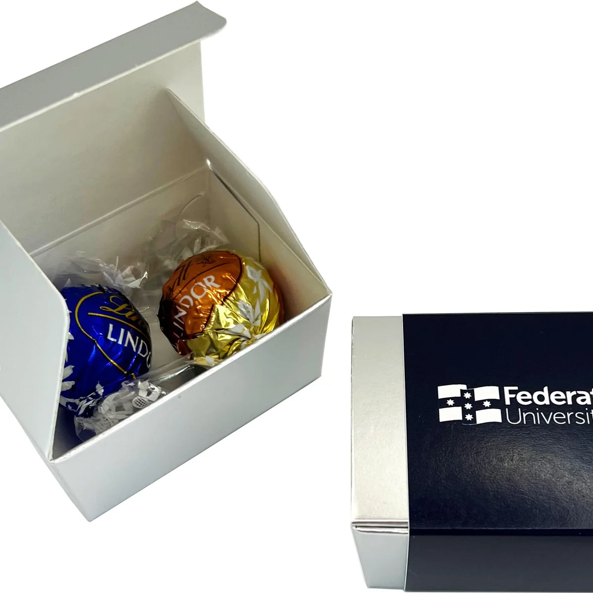 Premium Branded 2 Pack Lindt Ball Choc Box customised with your branding. Ideal for client gifts, events, and marketing giveaways.