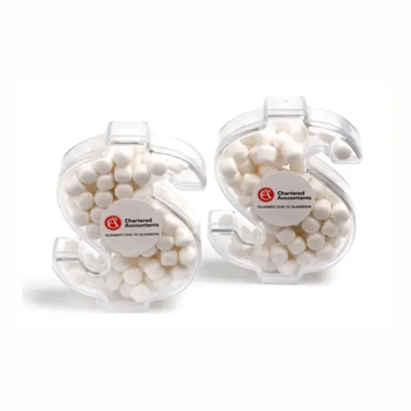Each acrylic dollar contains 40g of mints. Refreshing chewy mints in classic peppermint flavour. The dollar sign shape adds playful meaning to your gift — perfect for finance, sales, or value-focused messaging. These promotional acrylic shapes become keepsakes — the clear container showcases colourful contents while the unique shape adds meaning to your message.