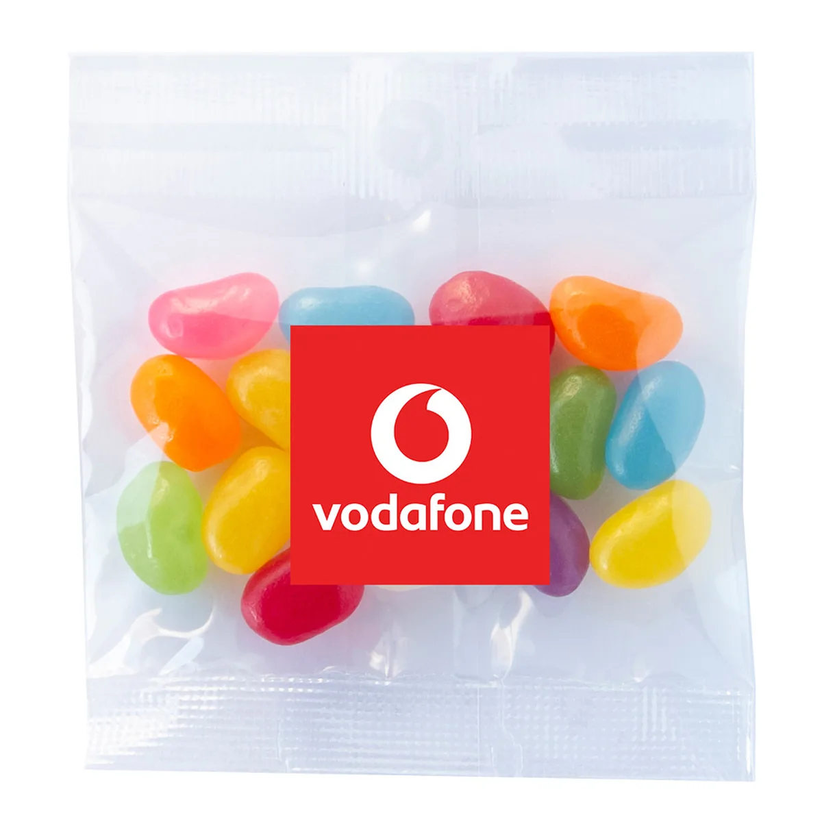 Your logo and details are printed in full colour on a custom digital label applied to the bag. The Allens jelly beans inside do the talking, while your label does the branding.