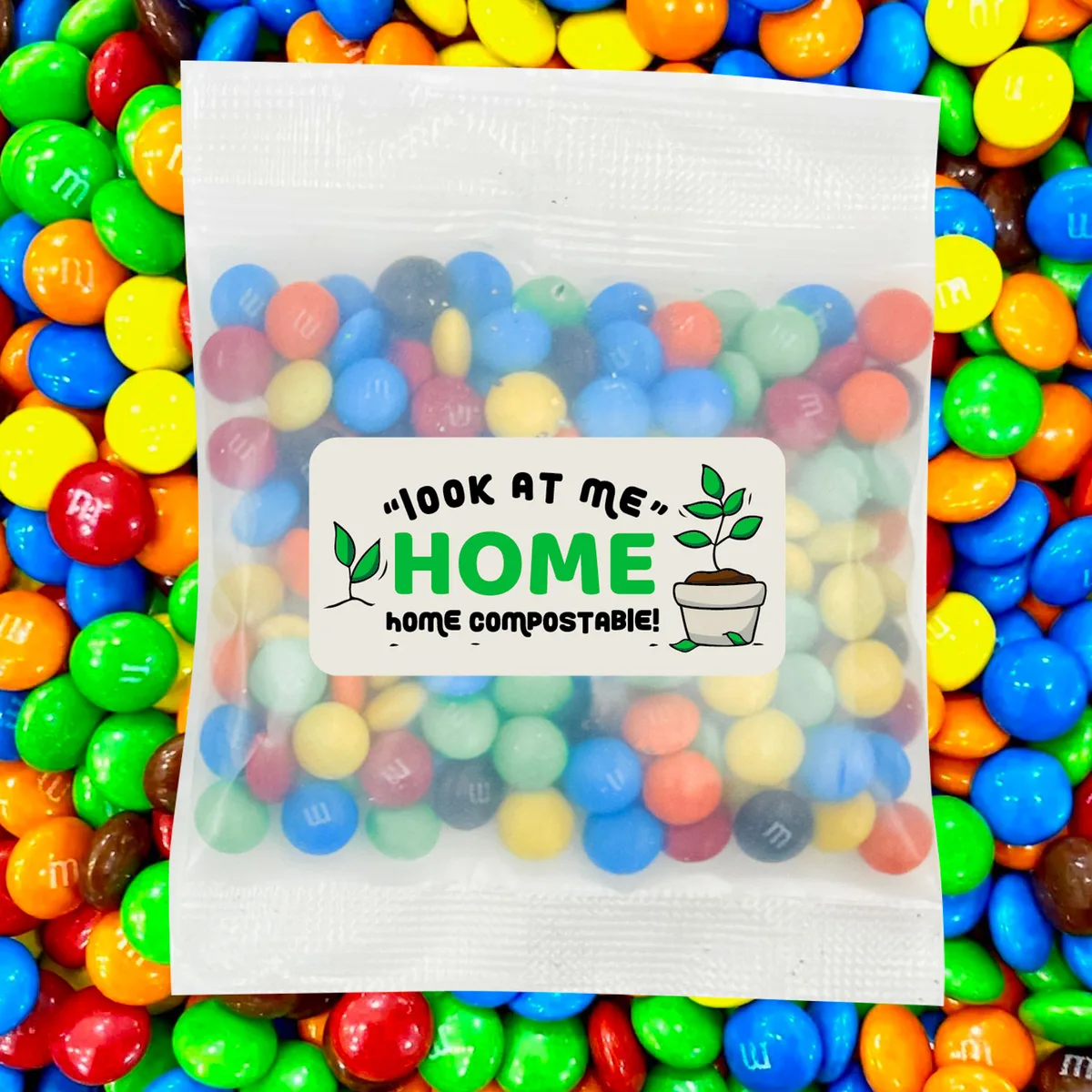 The compostable film maintains freshness and looks professional while breaking down naturally in a home composting environment. For businesses looking to reduce their plastic footprint without sacrificing the quality or impact of their promotional giveaways, these eco M&Ms bags are an excellent choice.