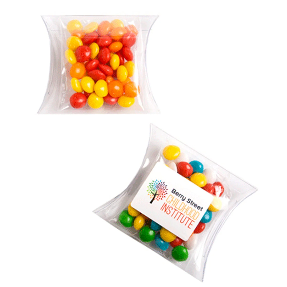 Each pillow pack contains 50g of chewy fruits. Fruit-flavoured chews in assorted colours. The curved pillow pack shape creates an elegant silhouette that looks premium on event tables, in gift bags, or as hotel amenities. These promotional pillow packs deliver upmarket presentation without the upmarket price — perfect for bulk gifting where quality matters.