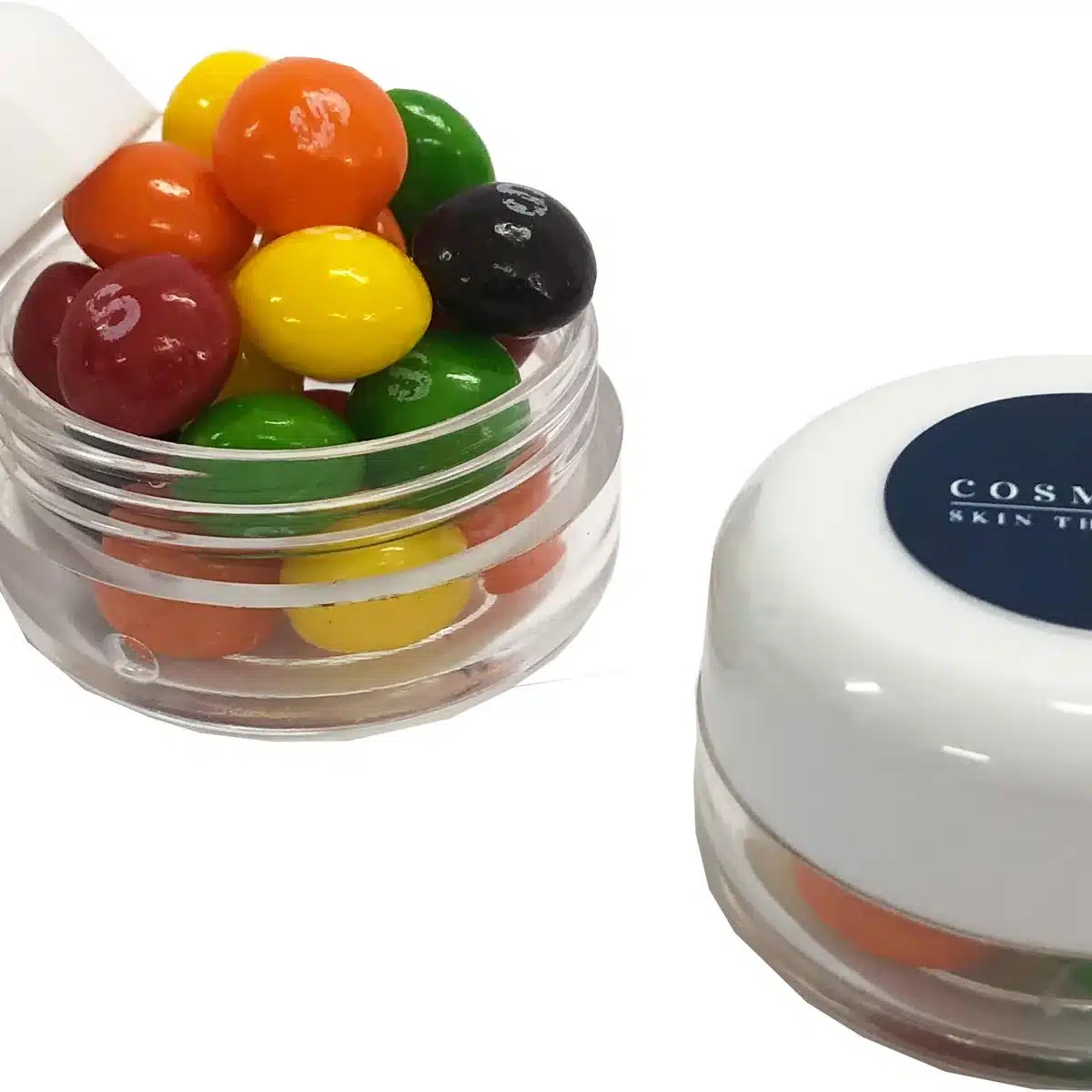 Branded Small Screw Cap Jar with Skittles 20g customised with your branding. Perfect for promotional events, corporate gifts, and marketing campaigns.