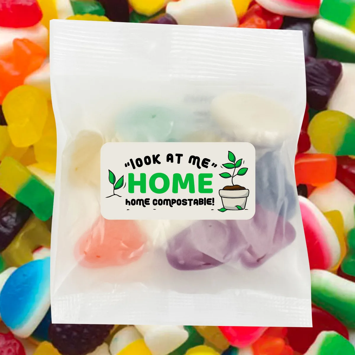Ships Australia-wide year-round. Bags are certified home compostable. Contents are an assortment of Australian-made jelly mix. The 30g bag measures 90mm x 100mm and the 50g bag measures 90mm x 120mm. Minimum order is 500 bags.