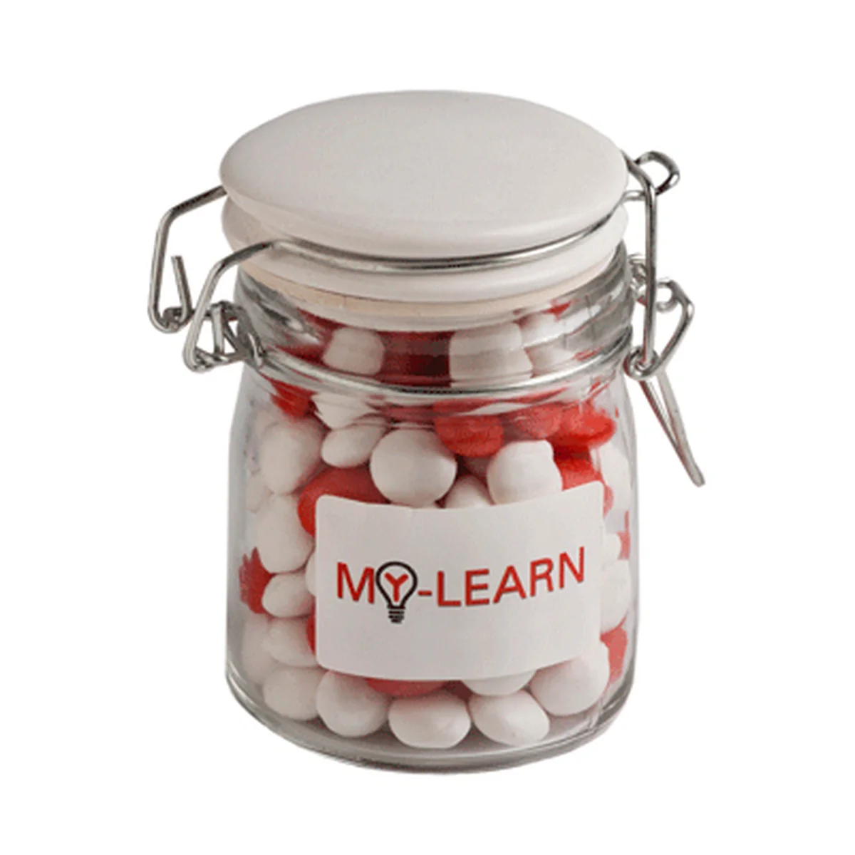 Custom Glass Clip Lock Jar with Chewy Fruit 160g customised with your branding. Perfect for promotional events, corporate gifts, and marketing campaigns.
