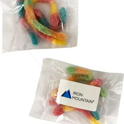 Custom Sour Worms 50g customised with your branding. Perfect for promotional events, corporate gifts, and marketing campaigns.
