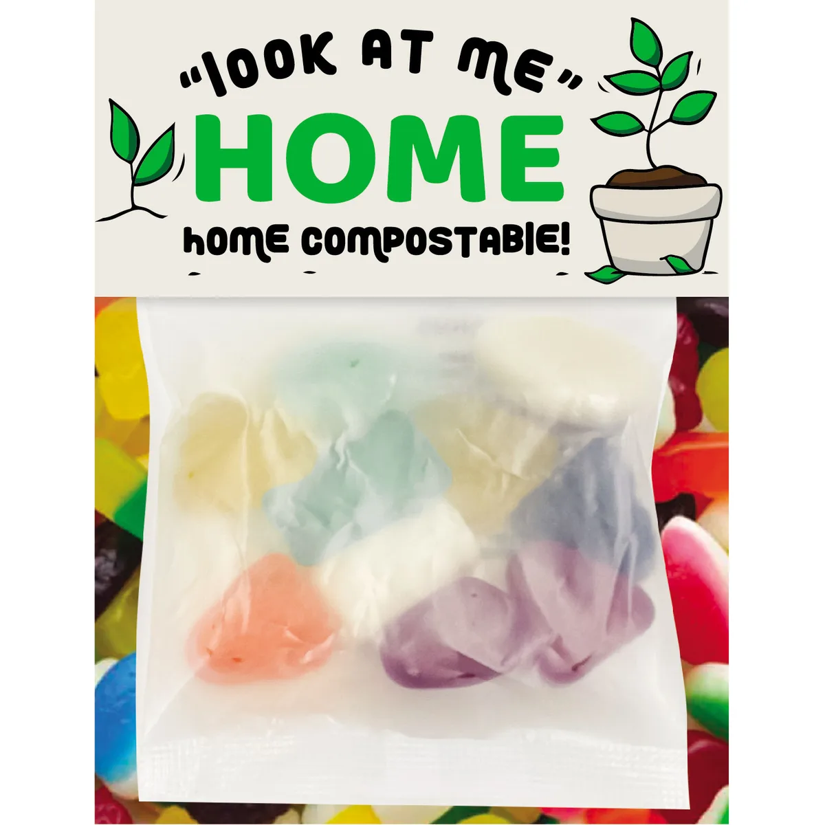 This eco billboard card combines the generous branding space of a full-colour printed card with a bag of Aussie Jelly Mix in certified home compostable packaging. The card is printed on both sides, giving you room for your logo, message, QR code, or promotional offer alongside a bag of colourful, chewy jelly favourites.