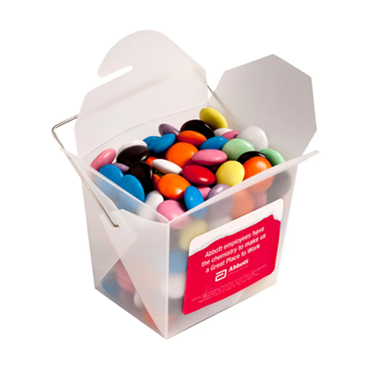 Smartie-style treats in packaging that gets kept. This colourful noodle box filled with smooth choc beans makes your brand part of someone’s desk decor.