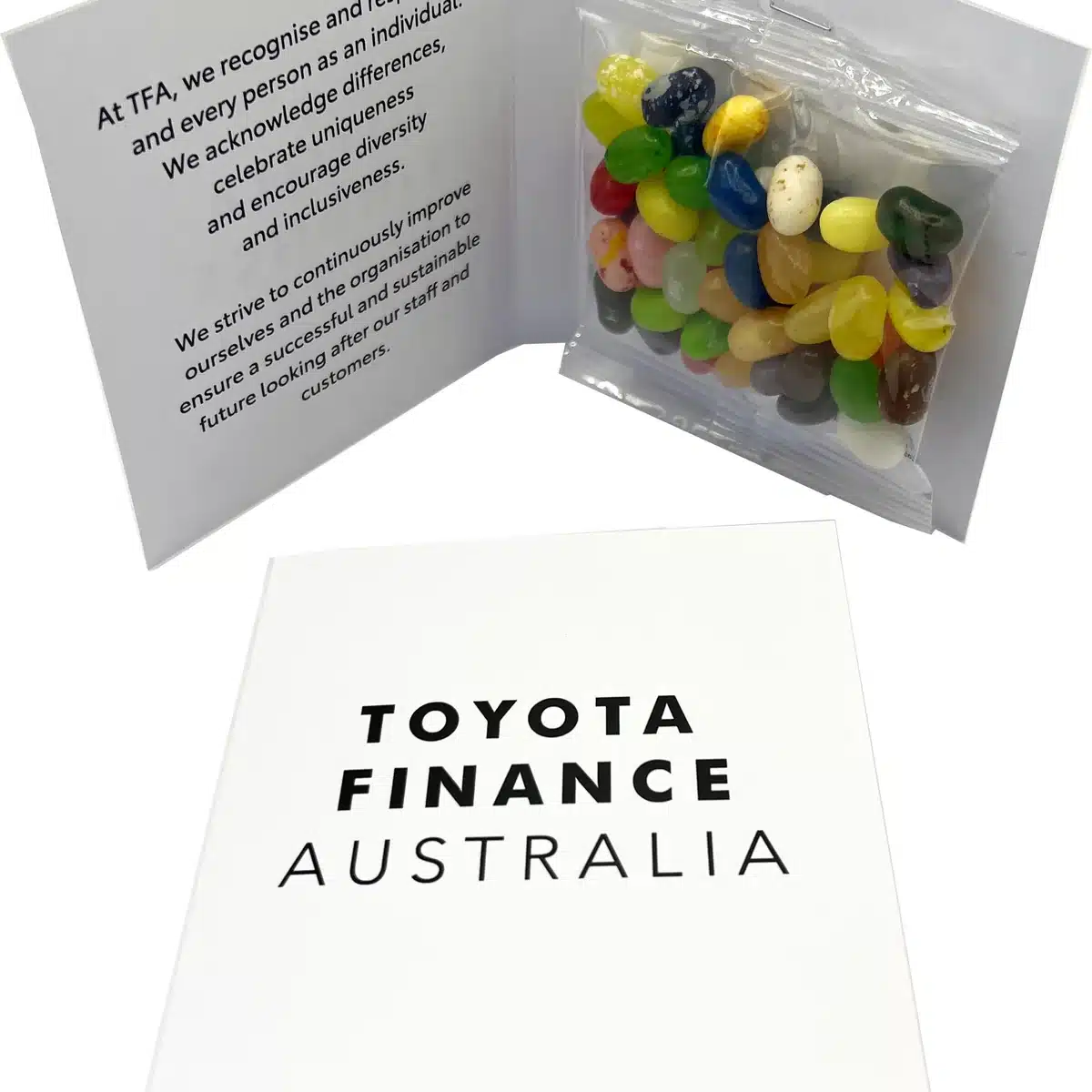 Each gift card includes 50g of Jelly Belly attached to a fully customisable card. Premium Jelly Belly beans in gourmet flavours. The card format gives you space for personalised messaging, QR codes, contact details, or promotional offers — all delivered with treats that ensure your card gets noticed and kept. These branded gift cards turn routine correspondence into memorable moments — the kind of greeting people actually look forward to receiving.