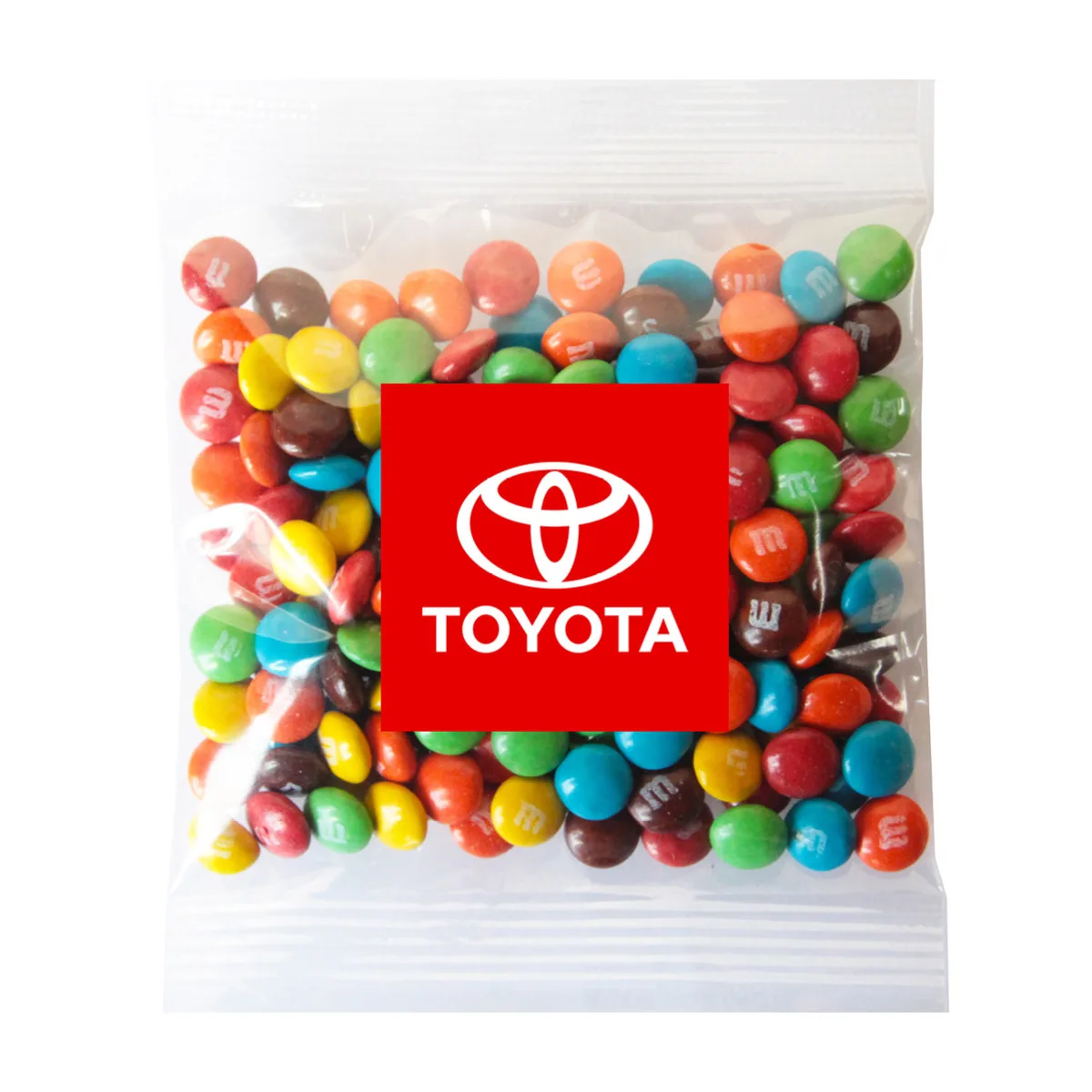 Your logo, message, and contact details are printed in full colour on a custom digital label on the front of the bag. The bright M&Ms colours visible through the packaging create an appealing contrast with your branded label.