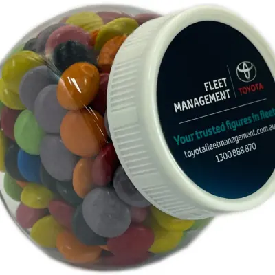 Each elegant apothecary jar contains 115g of jelly beans. Available in corporate colours or mixed colours including Black (Blackcurrant), White (Tutti Frutti), Blue (Blueberry), Green (Apple), Red (Strawberry), Yellow (Pineapple), Orange (Orange), Purple (Grape), and Pink (Watermelon). The classic apothecary style adds sophistication to any desk. These branded treats in jars are the kind of gift that doesn’t get thrown away — it becomes part of the office.